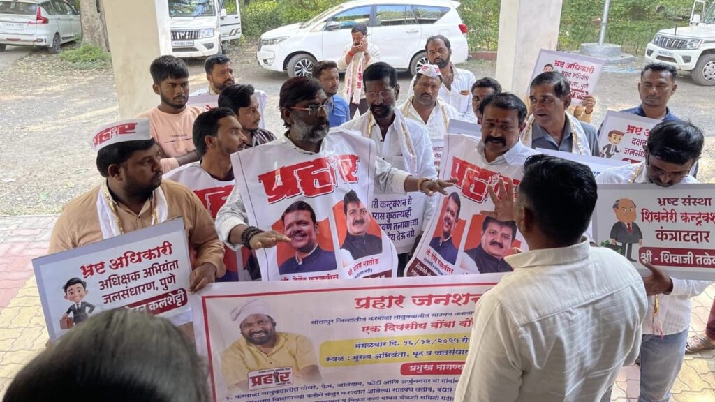केम(संजय जाधव):सोलापूर जिल्ह्यातील करमाळा तालुक्यातील केम, पोथरे, जातेगाव आणि इतर अनेक गावांमध्ये शिवनेरी कंट्रक्शन संस्थेने केलेल्या साठवण पाझर तलावाच्या निकृष्ट कामाच्या विरोधात प्रहार जनशक्ती पक्षाने आज, बुधवार दि. १६ डिसेंबर २०२५ रोजी, मुख्य अभियंता मृद व जलसंधारण विभाग, येरवडा, पुणे येथील मुख्य अभियंता कार्यालयासमोर ‘बोंबाबोंब’ आंदोलन केले.