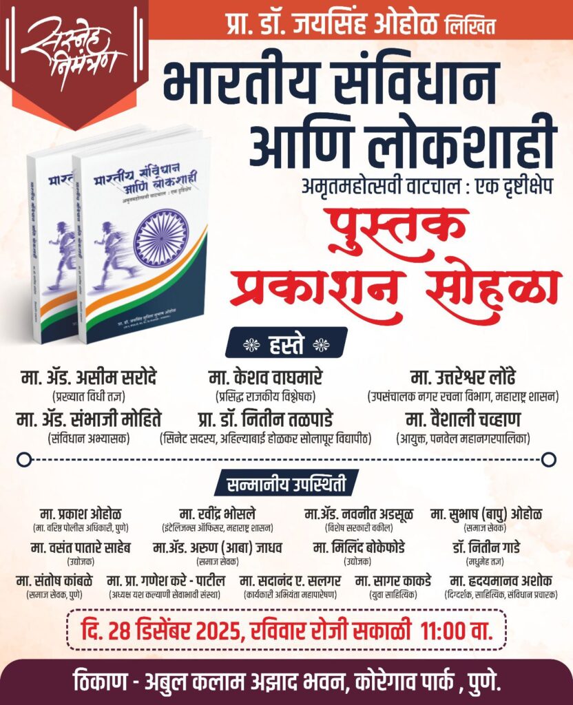 करमाळा,ता 22: हिवरे (ता. करमाळा) येथील रहिवासी, अभ्यासू प्राध्यापक व विचारवंत प्रा. डॉ. जयसिंग ओहोळ लिखित “भारतीय संविधान आणि लोकशाही अमृतमहोत्सवी वाटचाल : एक दृष्टिक्षेप” या महत्त्वपूर्ण पुस्तकाचा भव्य प्रकाशन सोहळा रविवार, दि. 28 डिसेंबर 2025 रोजी सकाळी 11 वाजता पुणे शहरातील अब्दुल कलाम आझाद भवन, कोरेगाव पार्क येथे संपन्न होणार आहे.