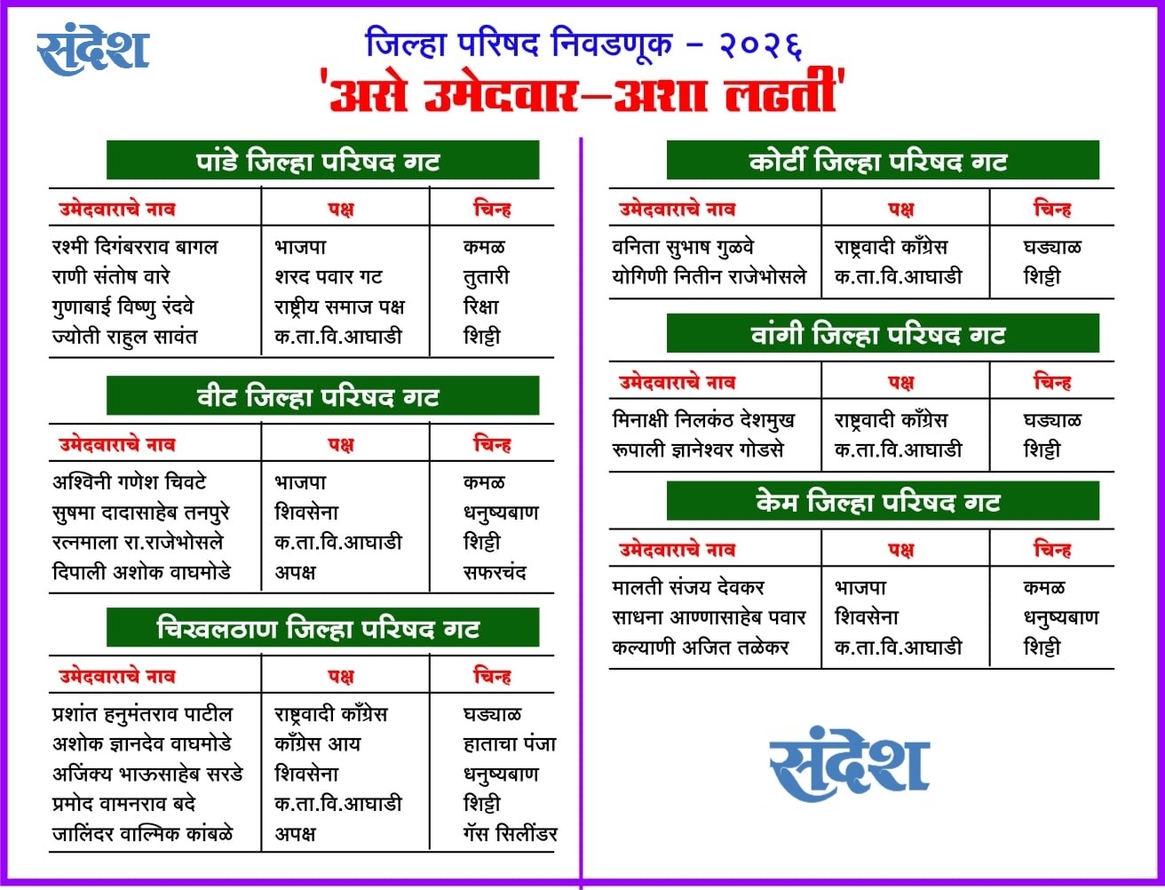 अशा या जिल्हा परिषदेच्या सहा आणि पंचायत समितीच्या बारा गाणांमध्ये लढती होत असल्याचे चित्र स्पष्ट होत आहे उद्यापासून हे सर्व उमेदवार आपल्या चिन्हाचे प्रचाराला लागलेली दिसतील.