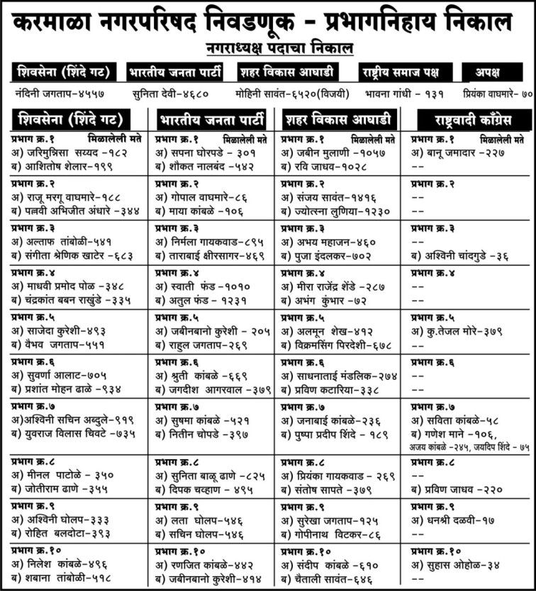 करमाळा नगरपरिषद प्रभागनिहाय निकाल... -