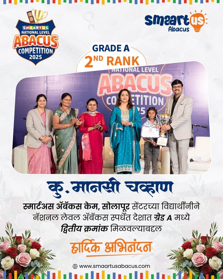 केम(संजय जाधव): स्मार्टअस अबॅकस क्लासेस, केम यांच्या वतीने राष्ट्रीय स्पर्धेत यश मिळवलेल्या विद्यार्थ्यांचा सत्कार समारंभ केम येथील राम मंदिर येथे पार पडला. २५ डिसेंबर २०२५ रोजी पुणे येथे झालेल्या राष्ट्रीय अबॅकस स्पर्धेत देशभरातून सुमारे १५०० विद्यार्थी सहभागी झाले होते. या स्पर्धेत स्मार्टअस अबॅकस क्लासेस, केम येथील एकूण १३ विद्यार्थ्यांनी सहभाग घेतला होता. यामध्ये केम येथील मानसी चव्हाण हिने ग्रेड ‘ए’ मध्ये देशात द्वितीय क्रमांक मिळवून उल्लेखनीय यश संपादन केले.