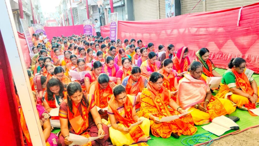 करमाळ्यातील अथर्वशीर्ष पठणाला महिलांचा उत्स्फूर्त प्रतिसाद; आज ५१ पैठण्यांचा लकी ड्रॉ